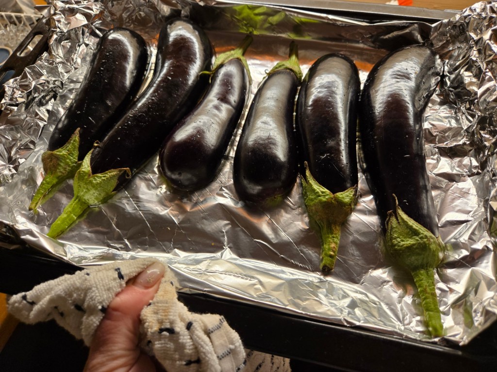 Meanwhile, we roasted halved aubergines in olive oil, until tender, then scooped out their flesh, adding it into the meat sauce, simmering away.