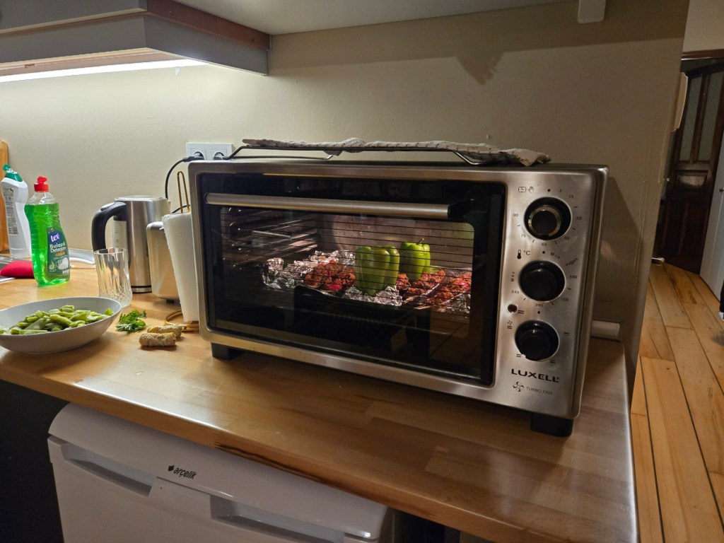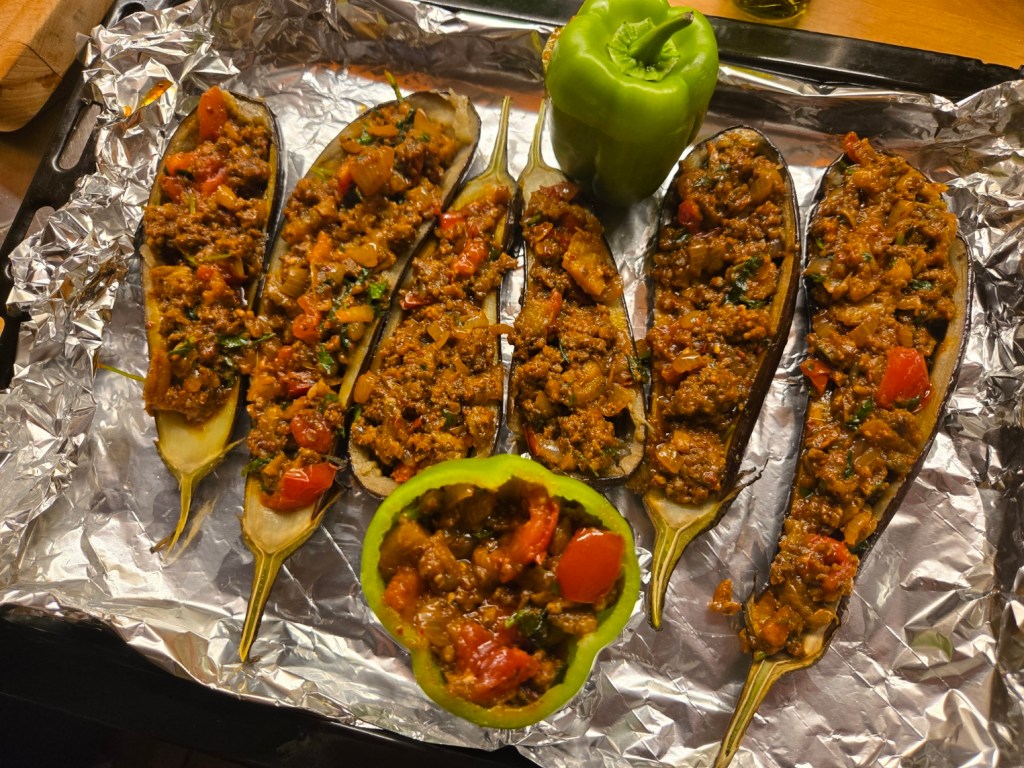 Finally, we filled the aubergine skins (and a couple of peppers) with the meat filling and baked them for 20 mins in our handy tabletop oven.