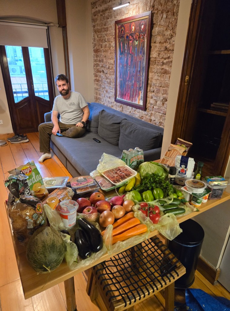 We’re mainly trying to cook for ourselves while travelling, both in an effort to control our budget, but also to see what we can get our hands on in local shops and markets and try our hand at learning some new recipes. Today we found ourselves in an excellent local shop, and we filled our boots with a big, yet very reasonably priced haul (see photo below, with Matt looking very sharp after a visit to a real Turkish barber today).
