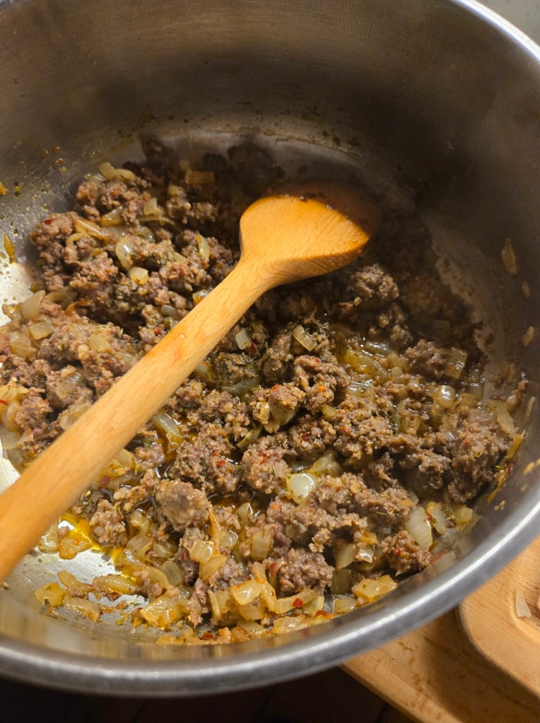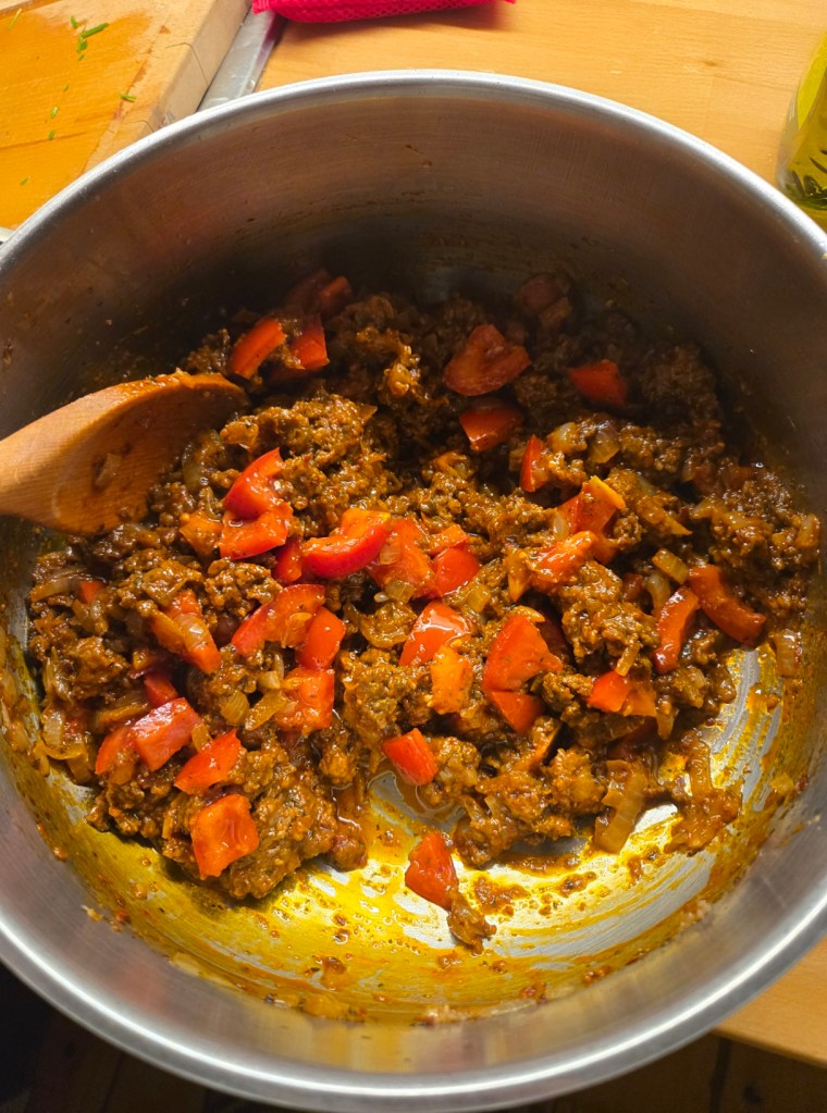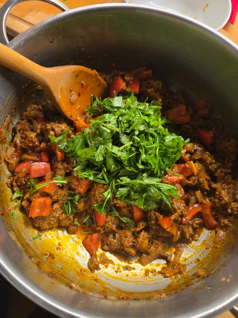 Like most recipes, we started by dicing an onion. After frying it off, then adding some mince, tomatoes, red pepper paste, parsley and chilli we had a delicious meat sauce.