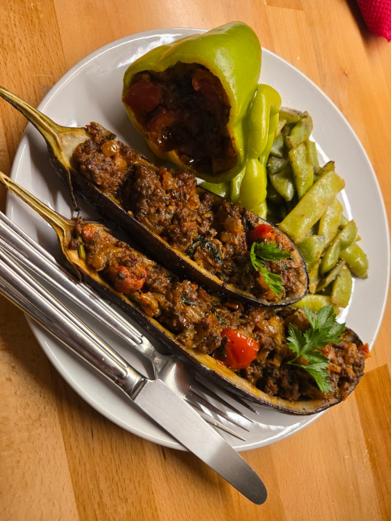 On the menu for tonight is Karnıyarik: aubergine stuffed with a spiced meat sauce!