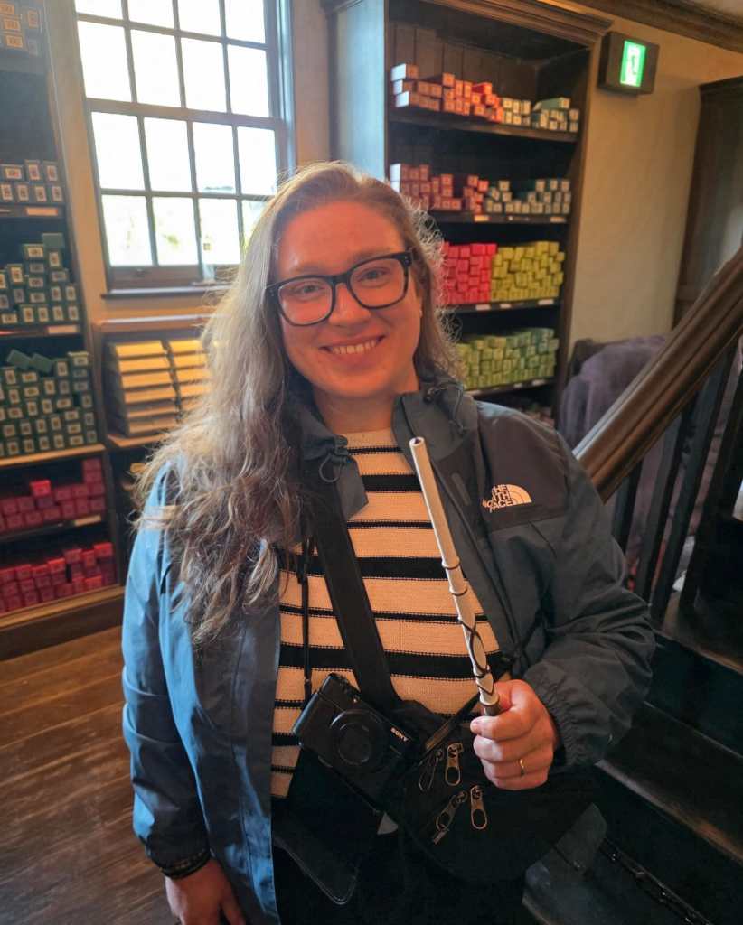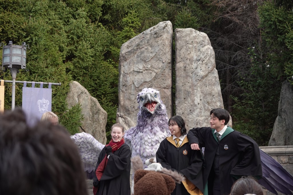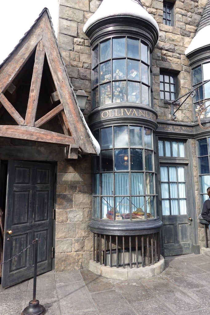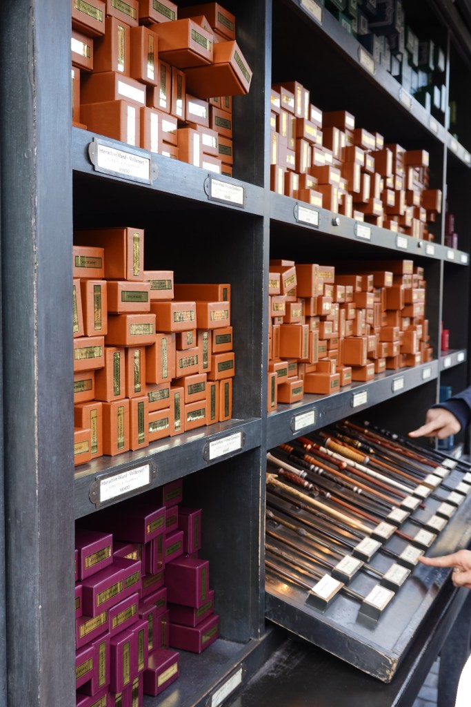 As we walked past Ollivander’s wand shop, we noticed a queue to go in. We joined and were shepherded into a dimly-lit room with floor-to-ceiling bookcases filled with boxes of wands. An actor, who did a wonderful job of delivering the story in both English and Japanese, talked us through how the wand chooses the wizard before perusing the crowd. His eyes centred on Iris in the front row. “Ah,” he said, “I believe today is the day when you get your wand”.