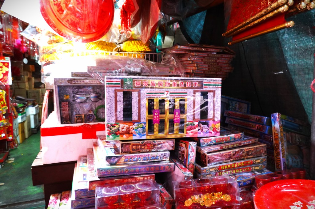 Did you know that a Lunar New year tradition is to burn ‘ghost money’? By burning paper representations of money, goods, or gifts, you can ensure your loved ones in the afterlife still get presents. We walked past shops selling miniature papers cars, paper jewellery, and even a whole paper 7-11 store! In case you’re wondering, burn a paper fully-stocked wine cellar for me if I die or I’ll come back to haunt you.