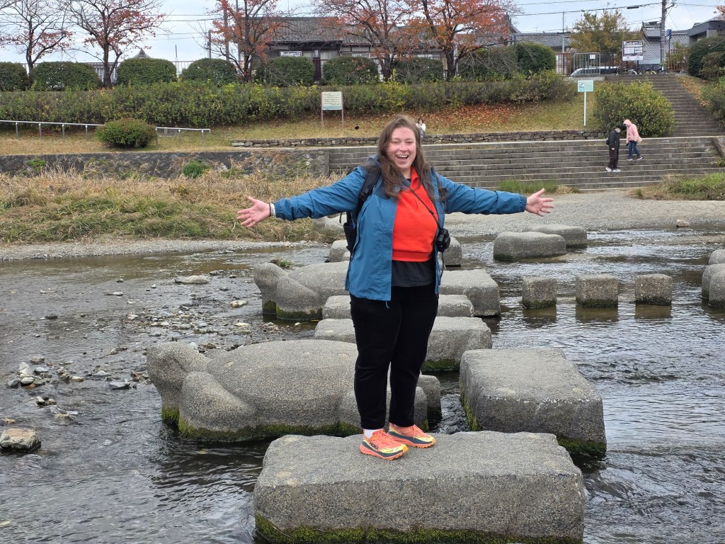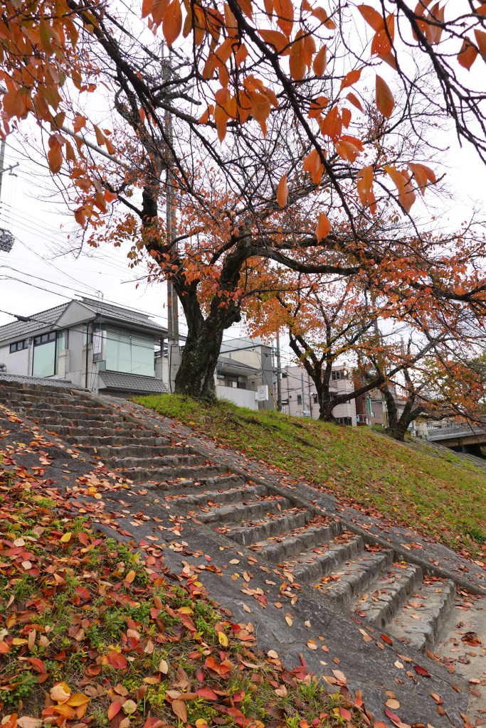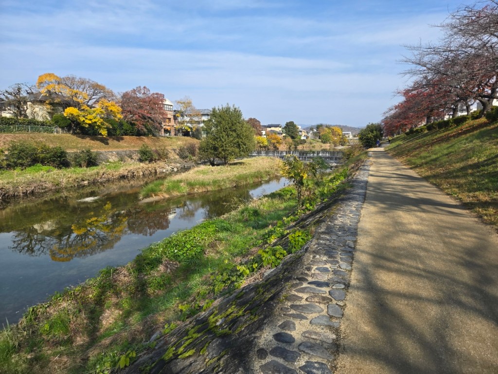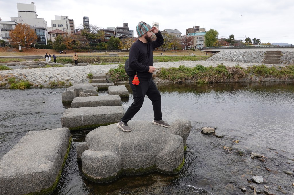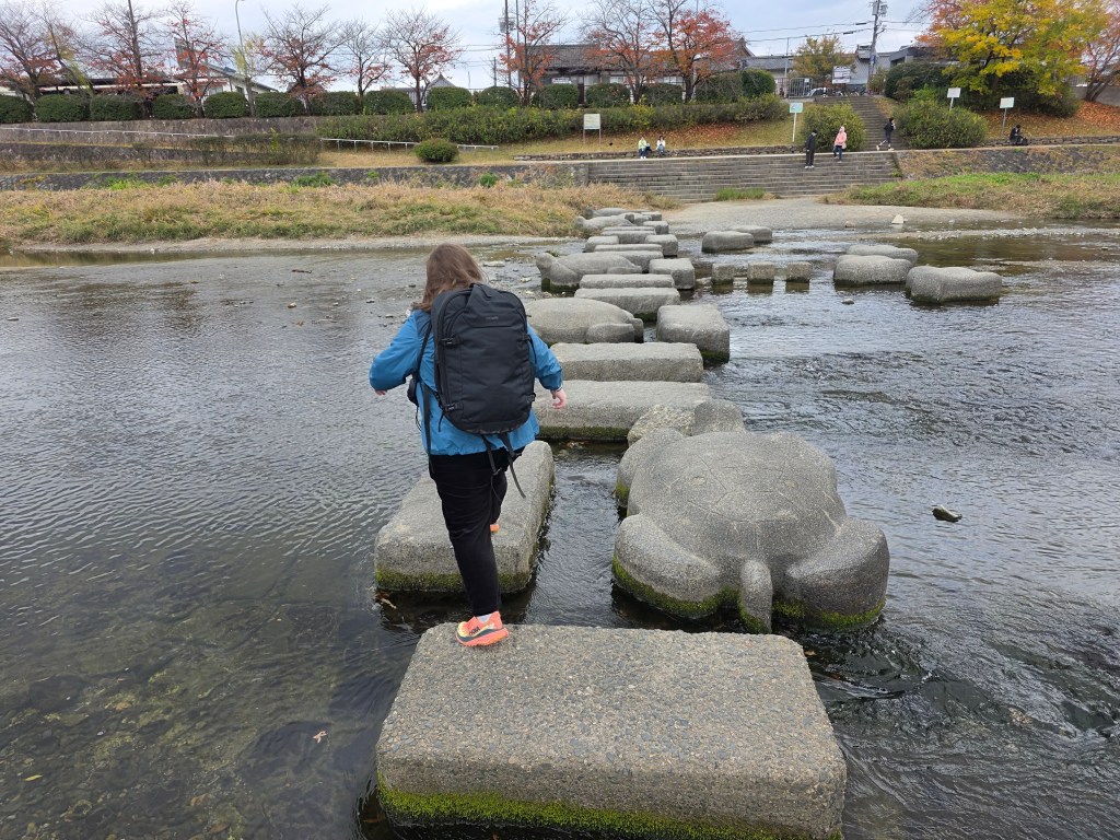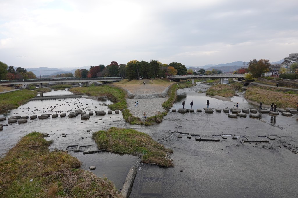 After a quiet first evening, on our first full day we ventured into the city walking around an hour along the scenic footpath beside the Takano River as it joins with the larger Kano River. This route has featured every day in our itinerary in Kyoto, as well as being beautiful, it also reminds us a bit of the Taff trail in Cardiff (although sadly Cardiff doesn’t have turtle stepping stones to cross the river in its counterpart).