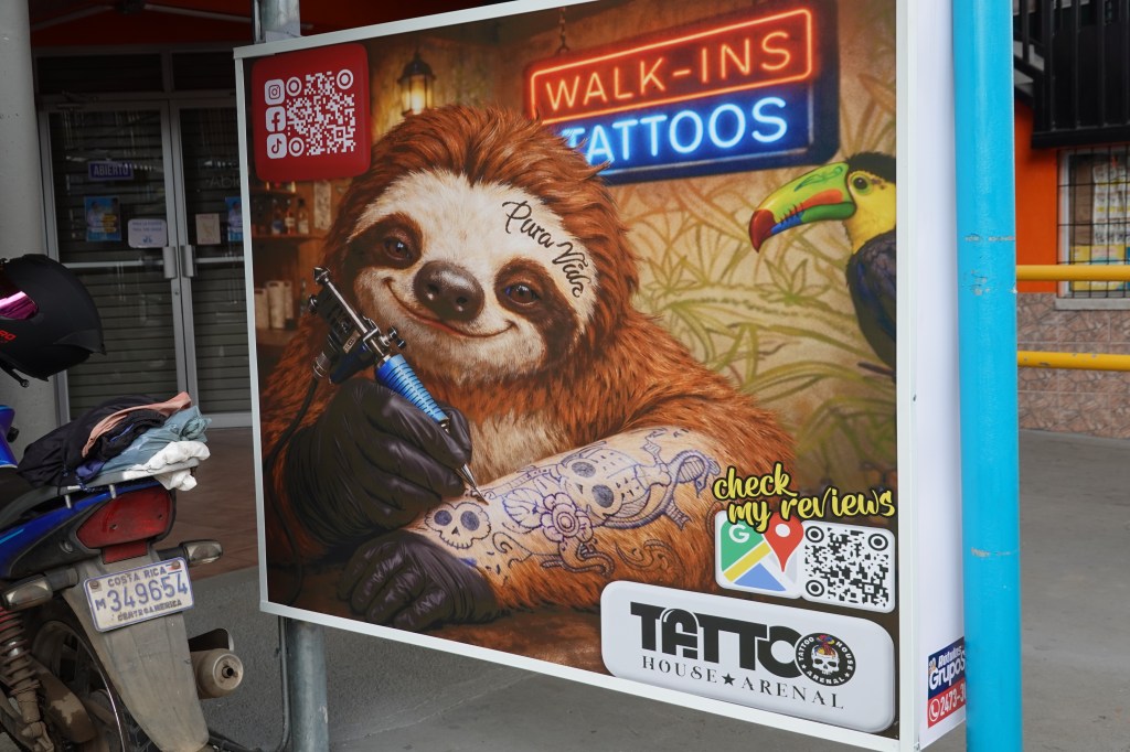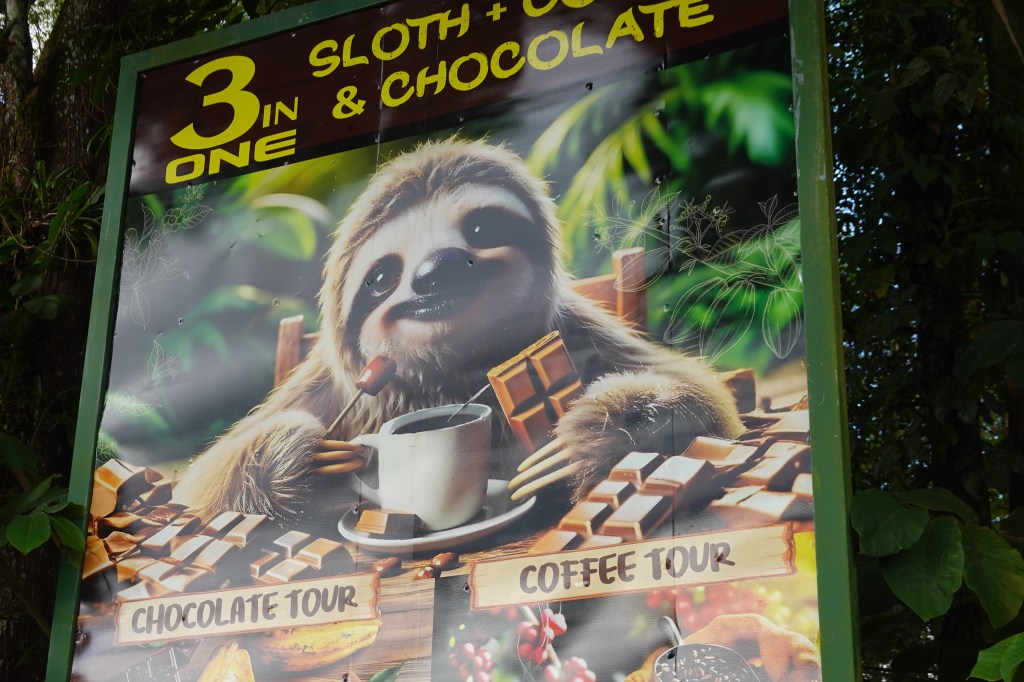 Of all our stops in Costa Rica Arenal felt the most tourist-y. There were many gift shops around selling all kinds of tat. It also turns out there must have been a by-law in place that every business had to have some kind of uncanny-valley AI-generated sloth picture. We provide a couple of these for your enjoyment/horror.